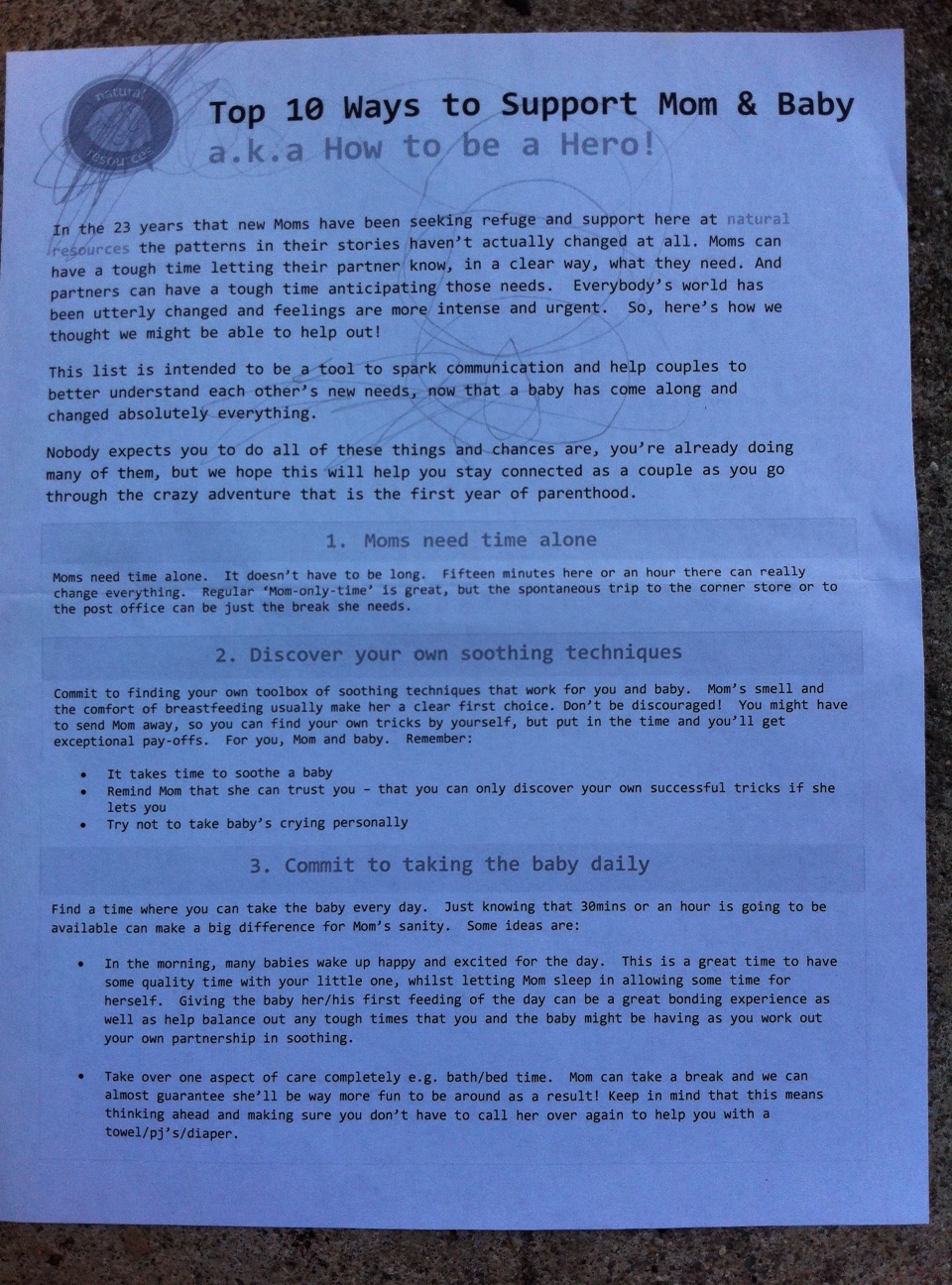 A handout, below, from our neighborhood parenting center, Natural Resources. (My daughter added the scribbles.)