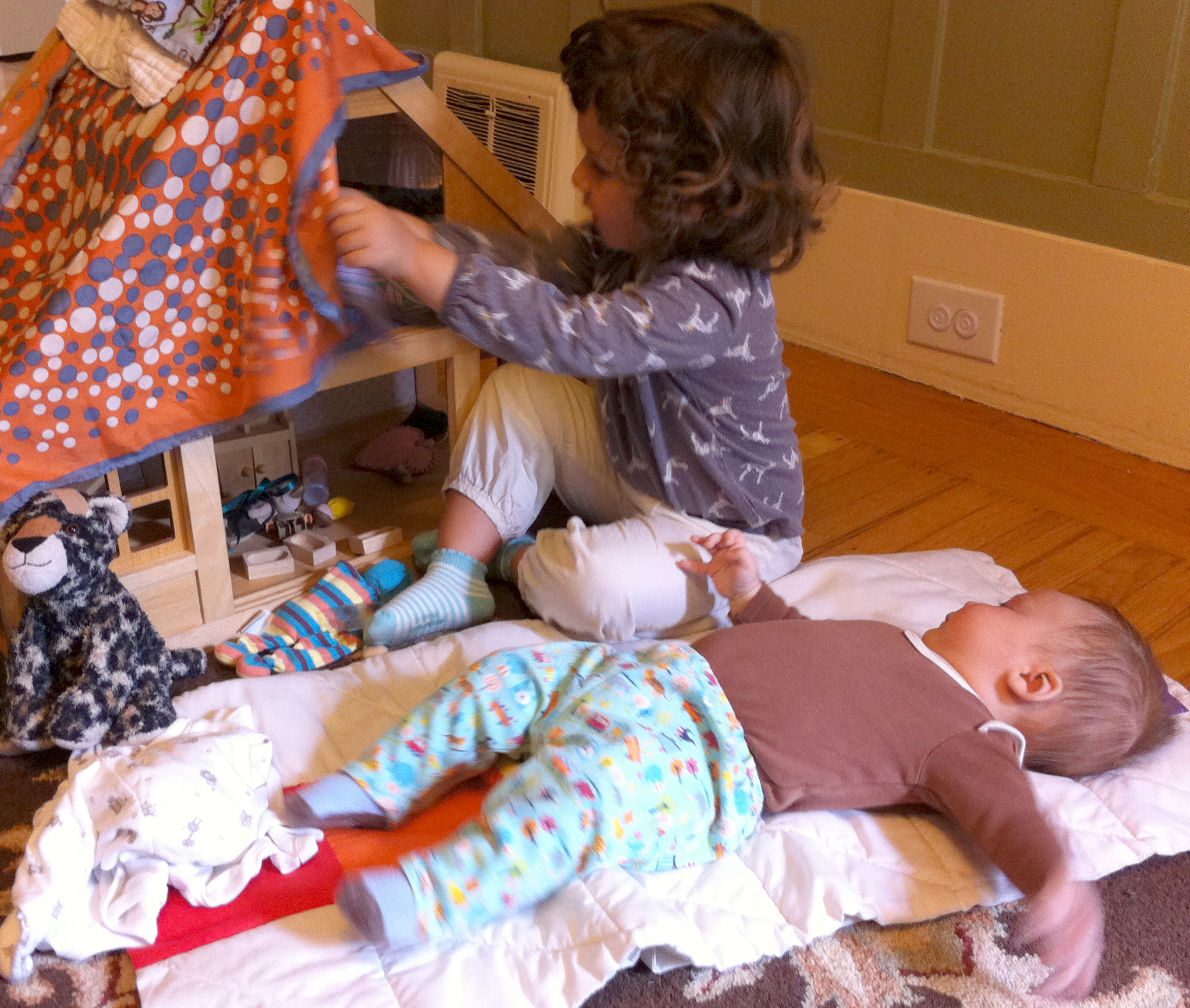 sibs playingShe fell in love. The hardest part of these early months has been holding her back from “over-loving” him, a term I recently heard. She wants to hug him and kiss him and squeeze him as hard as she can, his cheeks and nose and round belly. I tell her over and over how to touch him carefully, and she pays no attention at all. When I ask her why, she says, “because I LOVE him,” in this desperate way, like she just can’t control it herself! And it’s true, he laughs and coos loudest when she tells him a story; he frenetically kicks and wiggles on his back when she dances and sings around the living room. When she leaves the room, he complains desperately.