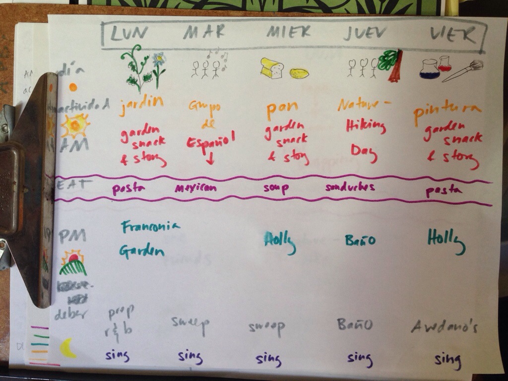 Each day has one central activity (those little pictures and the words in orange). The other parts of the day repeat. Tuesday and Thursday are our out-breath days when we see other families, while the other in-breath days we keep to ourselves, internal, mostly at home.